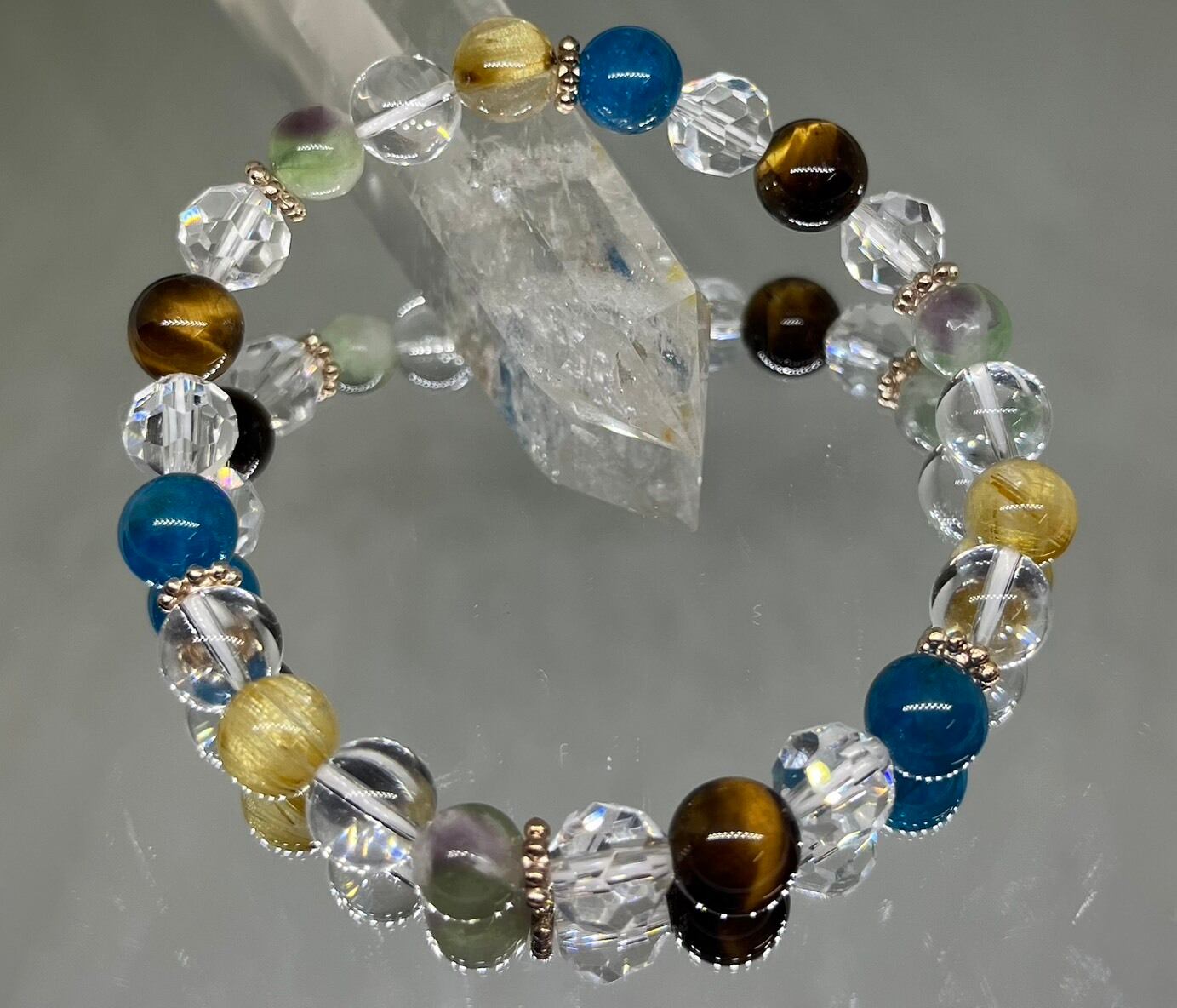 ー 粒サイズ : 約 7 ㎜(エンジェルフェザーフローライト)/約 8 ㎜(ゴールドルチルクォーツ)/約 8 ㎜(アパタイト)/約 8 ㎜(水晶)