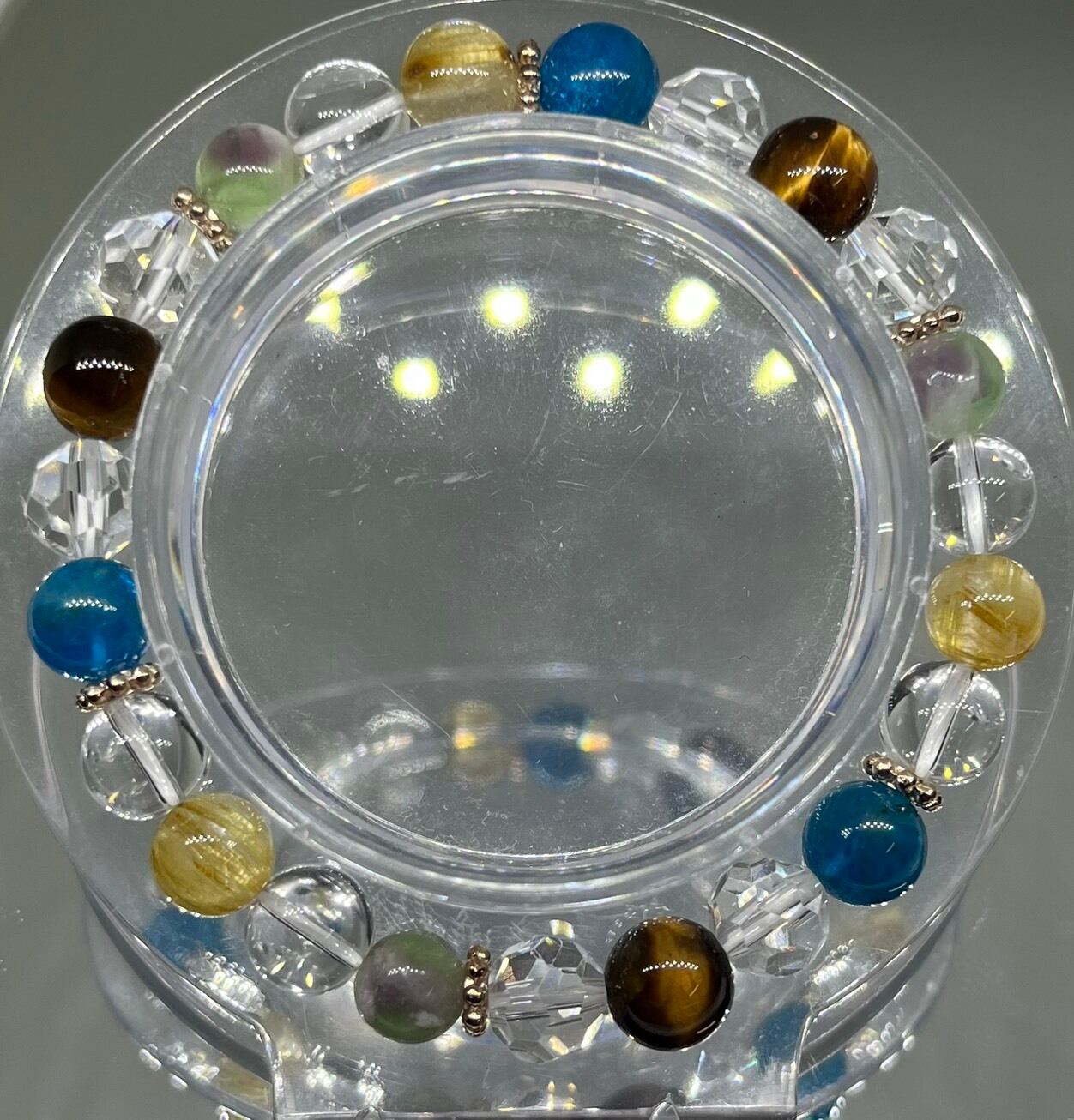 フローライトの思考整理、ゴールドルチルの金運、アパタイトの調和、タイガーアイの勝負運、水晶の浄化。